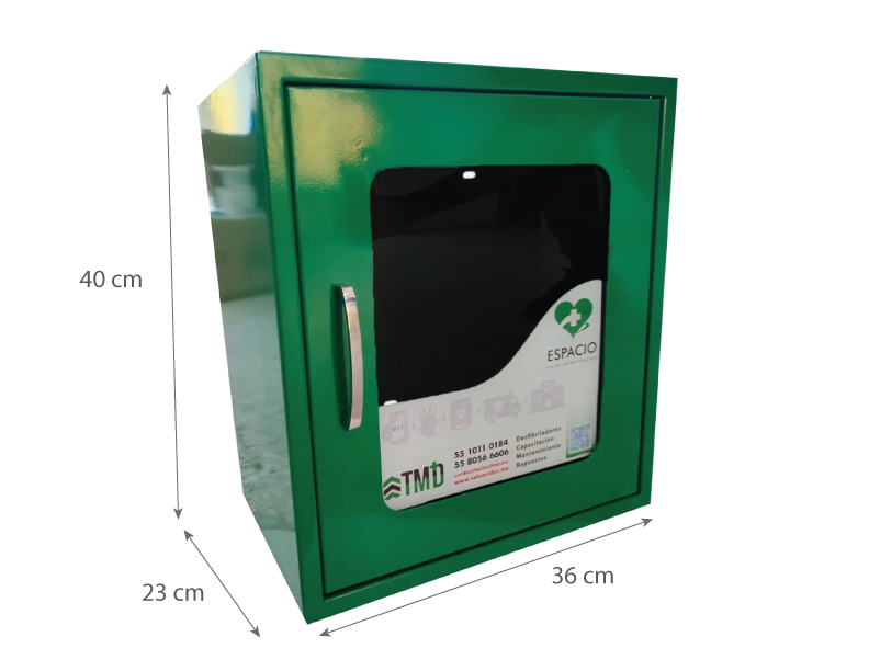 Nuevo diseño ligero y compacto compatible con todos los DEA, cuenta con nueva electrónica, alarma visual sonora, 3 años de autonomía (2 pilas AA) y sensor de puerta abierta (opcional).